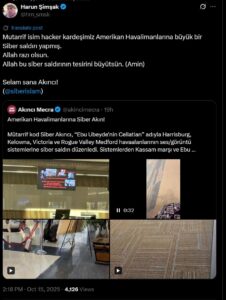 In coordinated incidents last week, hackers infiltrated public-address and display systems at several airports in the United States and Canada, broadcasting pro-Hamas and anti-Western propaganda that carried the signature of a cyber collective known as Siberislam, or Mutarrif. The attacks briefly disrupted operations but underscored a worrying expansion of ideologically driven Turkish cyber-activism into Western civilian infrastructure.
