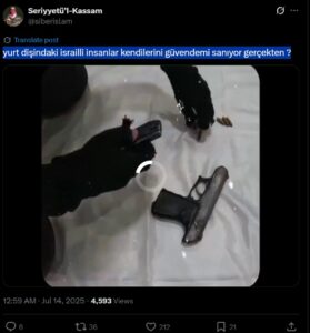 On July 14, 2025, the group uploaded a video showing a masked man loading bullets into a handgun accompanied by the taunting message in Turkish, “Yurt dışındaki İsrailli insanlar kendilerini güvende mi sanıyor gerçekten?” (Do Israelis abroad really think they are safe?). The post marked a clear escalation in the group’s intimidation tactics and illustrated how its online propaganda increasingly merges cyber operations with direct threats of violence on the streets against Jews.