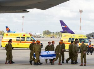 Soldiers carry the coffin of an Israeli national killed in the Istanbul suicide bombing upon its arrival from Turkey at Tel Aviv’s Ben Gurion Airport on March 20, 2016. (Photo by JACK GUEZ / AFP)