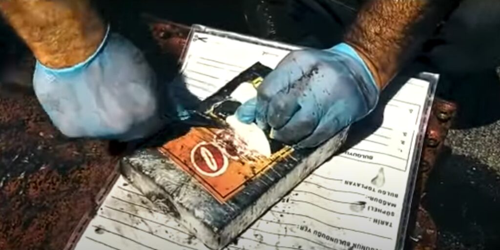 from one of the dozens of plastic-wrapped bags which were extracted from a metal container attached to the hull of a Chinese freighter that was transporting coal, according to its manifest.