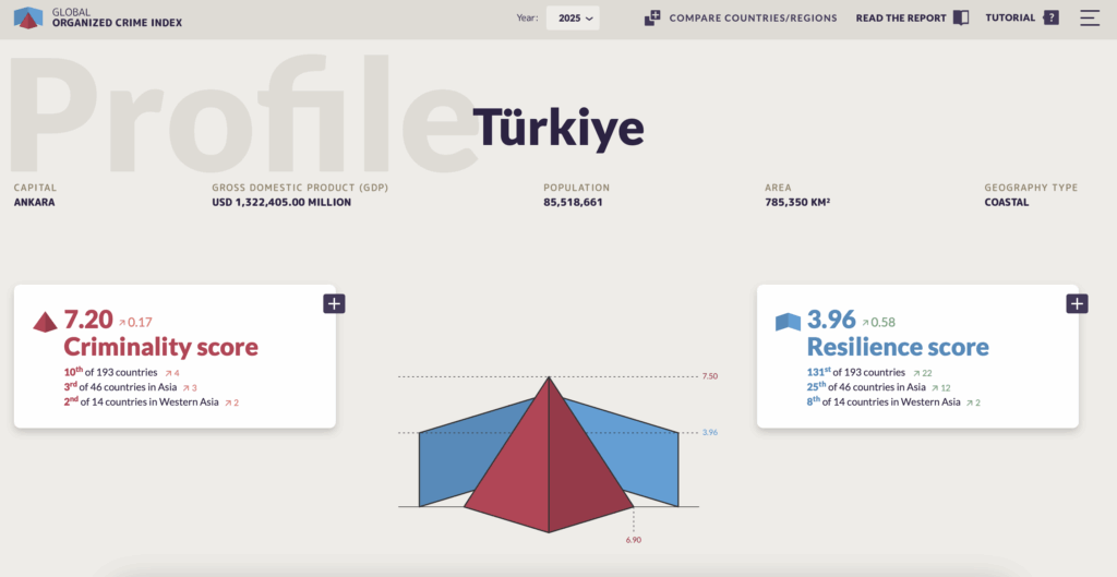 The 2025 index assigns Turkey a criminality score of 7.20, placing it 10th among 193 countries, third in Asia and second in Western Asia, reflecting a deterioration compared to 2023. Ranking among the top 10 means Turkey is among the countries with the highest levels of organized crime worldwide. The country’s resilience score stands at 3.96, ranking 131st globally, 25th in Asia and eighth in Western Asia. The index measures criminality through the presence of 15 illegal markets and the influence of organized crime groups, while resilience reflects a country’s capacity to counter them through governance, justice and civil society.
