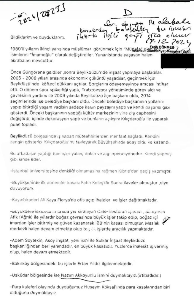 The letter alleges that İmamoğlu’s family changed its surname in the 1980s. It also accuses İmamoğlu of deceiving political figures to secure his initial mayoral candidacy and describes his public work as deceptive. None of the claims are supported by documentation in the case file.