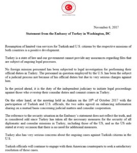 In an email dated November 8, 2017, Aysem Uraz asked Perrone for an update on her brother’s trial and said their diplomat brother Cenk would call him. She also attached a press release issued two days earlier by the Turkish Embassy in Washington defending the arrest of US consulate employees in Turkey and referring obliquely to Tunc’s case in the US.