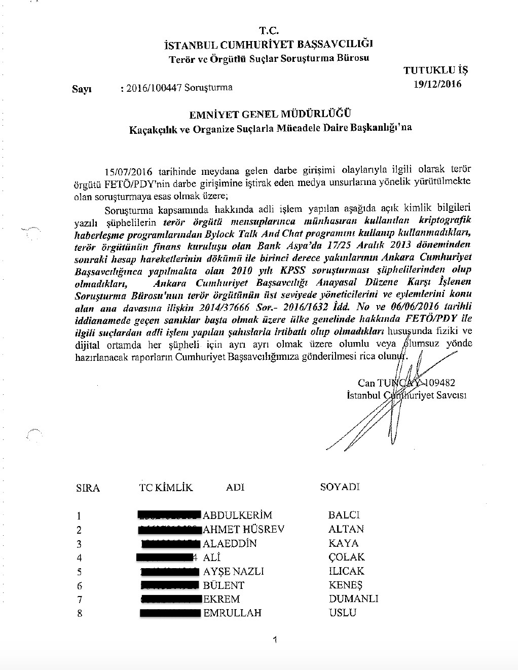 In addition to cases involving teachers and academics, Tuncay supervised or participated in investigations targeting civil servants and other professionals suspected of links to opposition groups.
