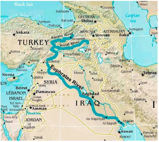 Together the two rivers form the core freshwater system of the northern Middle East. The Euphrates stretches roughly 2,800 kilometers from Turkey through Syria and into Iraq. The Tigris also begins in Turkey and flows southeast into Iraq, where the two rivers eventually merge before reaching the Persian Gulf.
